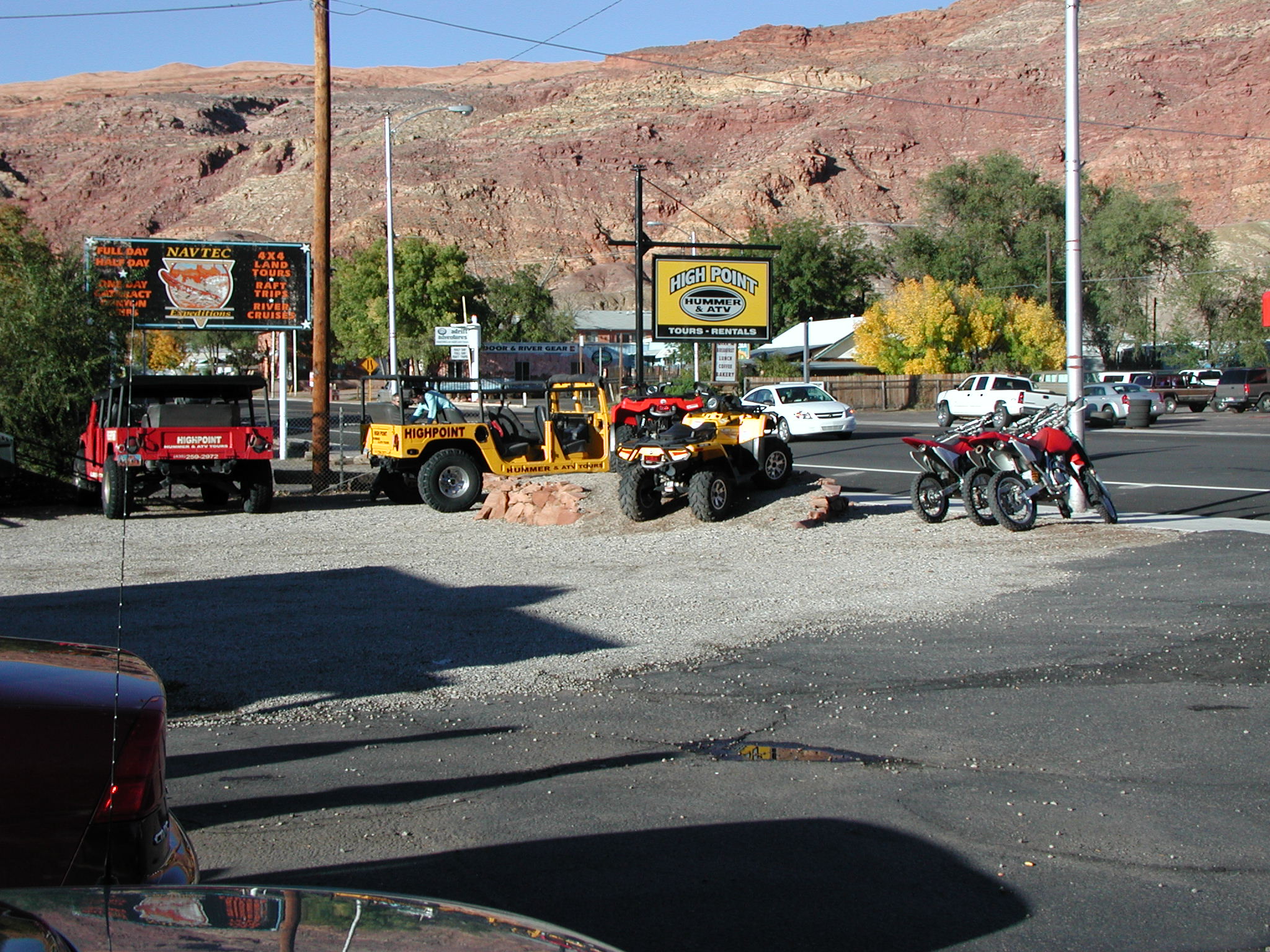 | 281 N. Main, Moab Utah. You can rent motorcycles, Jeeps, mountain bikes and single or double wide ATVs for 4 or 24 hours. Guided 2 and 4 hour tours are available several times each day. The Colorado River crosses US-191 - aka Main St. in Moab - just 2 miles north of High Point Tours, so add Rafting Tours to the Hight Point adventure list. They also offer guided hiking/climbing tours as well. |